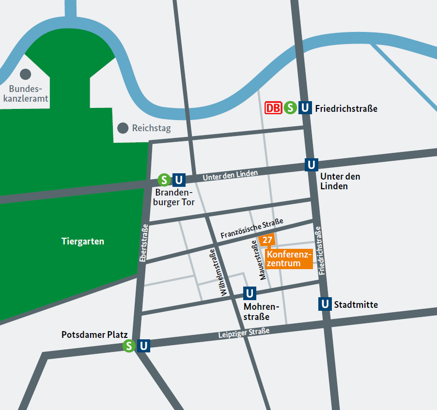 - Das Konferenzzentrum liegt zwischen den U-Bahnhöfen Mohrenstraße (U2) und Unter den Linden (U6) sowie dem S+U Bahnhof Brandenburger Tor (S1, S2, S 25 und U5)